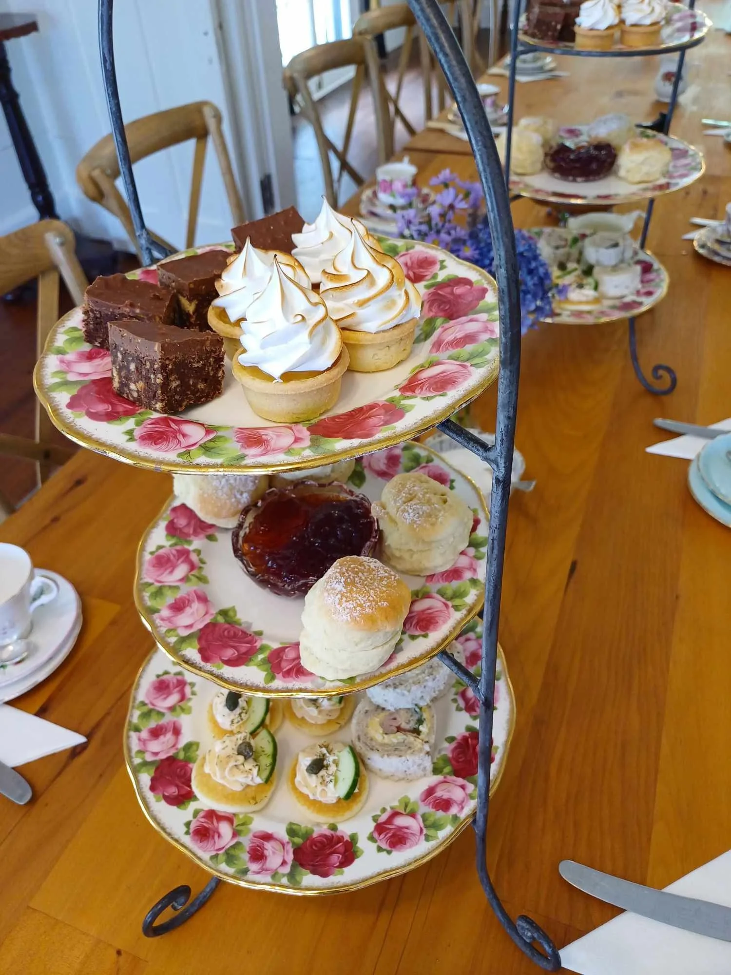 High tea luncheon, $32 per person - tea/coffee, sandwiches & savouries, scone with cream & jam, x2 sweet treats (vintage china crockery).